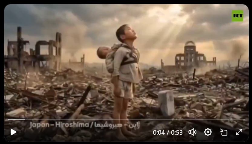 内容は、アメリカのネイティブインデアン、広島の赤ちゃんをおんぶした少年、ベトナム、イエメン、パレスチナ、エプスタイン島の子供らが空を見上げる動画で、最後はイランから発射された弾道ミサイルが自由の女神(悪魔を表す牛の顔)を破壊します。