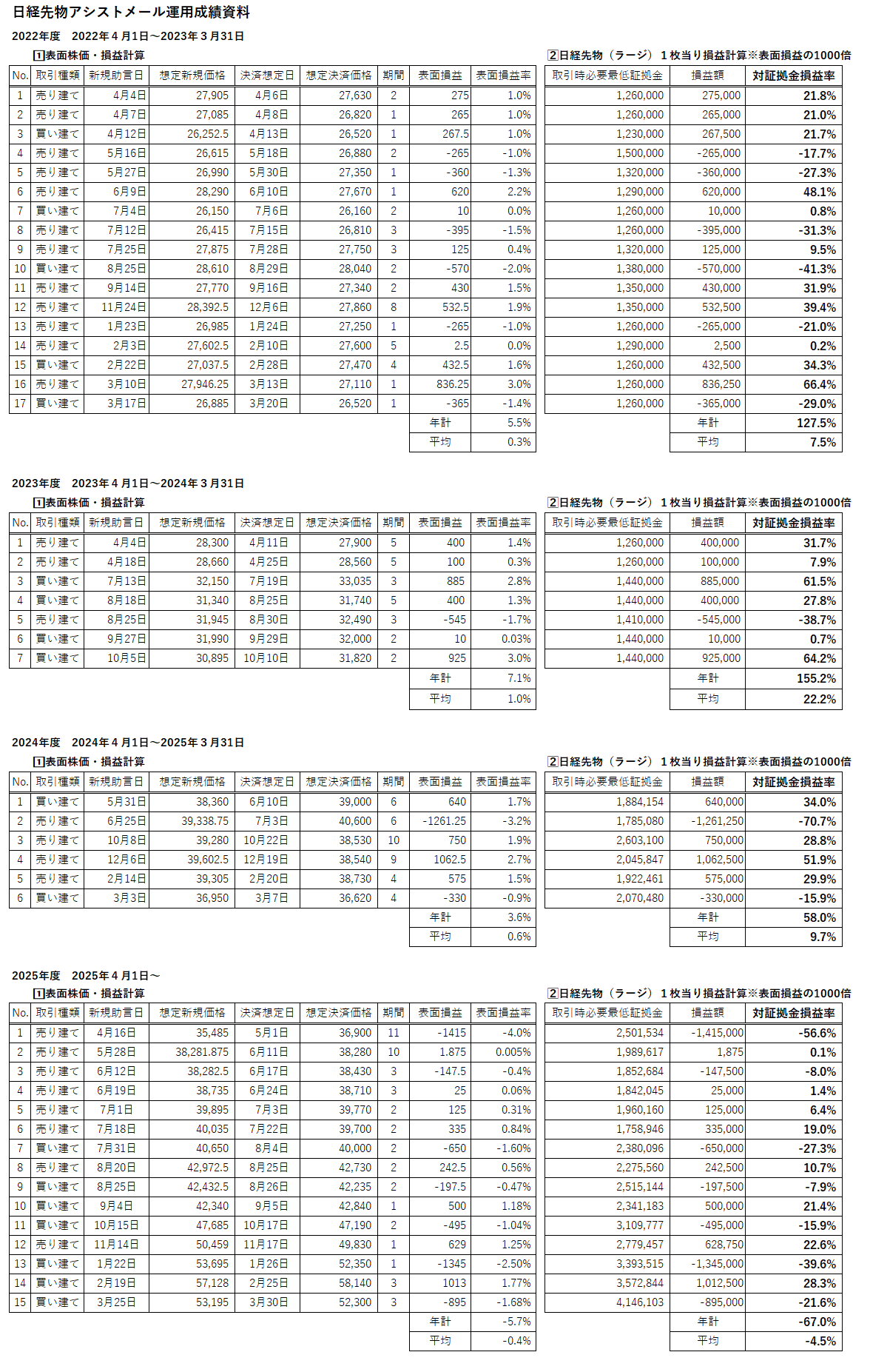 ※日経先物ラージ1枚当たりの年間損益額及び利益率の合計額です。