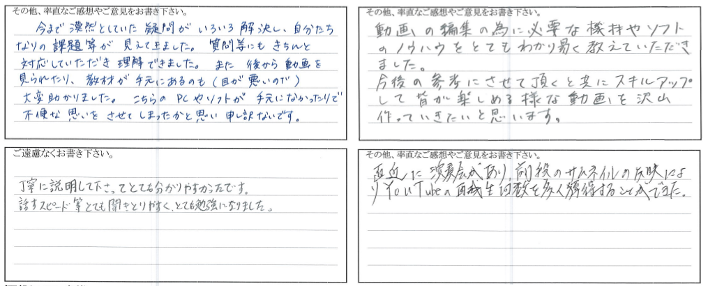 | T. S 様 実際にYouTubeを運用する流れに沿った講義カリキュラムなので、復習しやすく分かりやすく学ぶことが出来ました。職場単位で受講できたので、後の作業の分担なども大変スムーズでした。 |