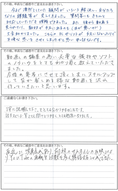 | T.O 様 講義で学んだ、”クリックされるサムネイルの特徴”を取り入れたことで、再生数を向上することが出来ました。 |